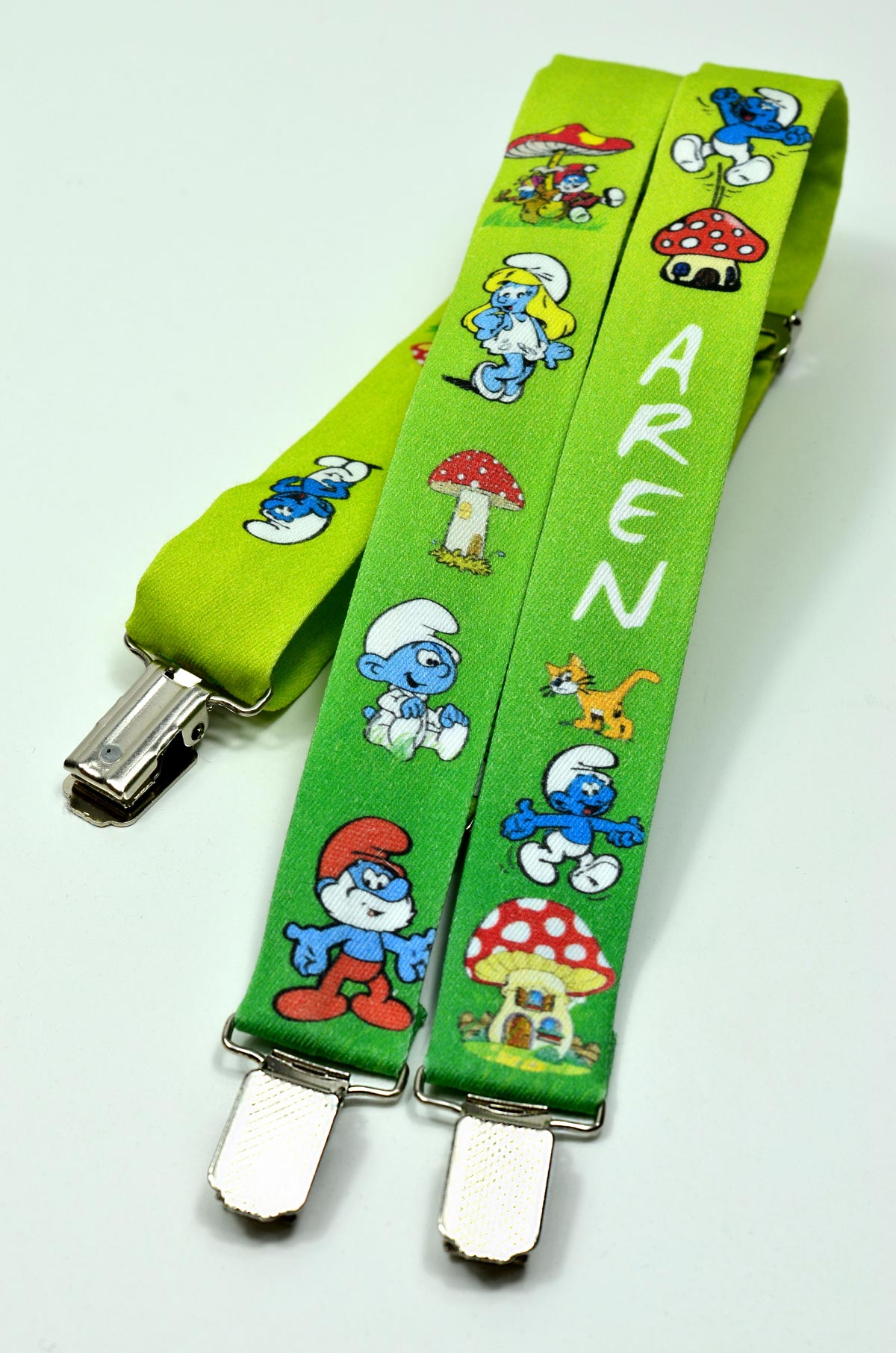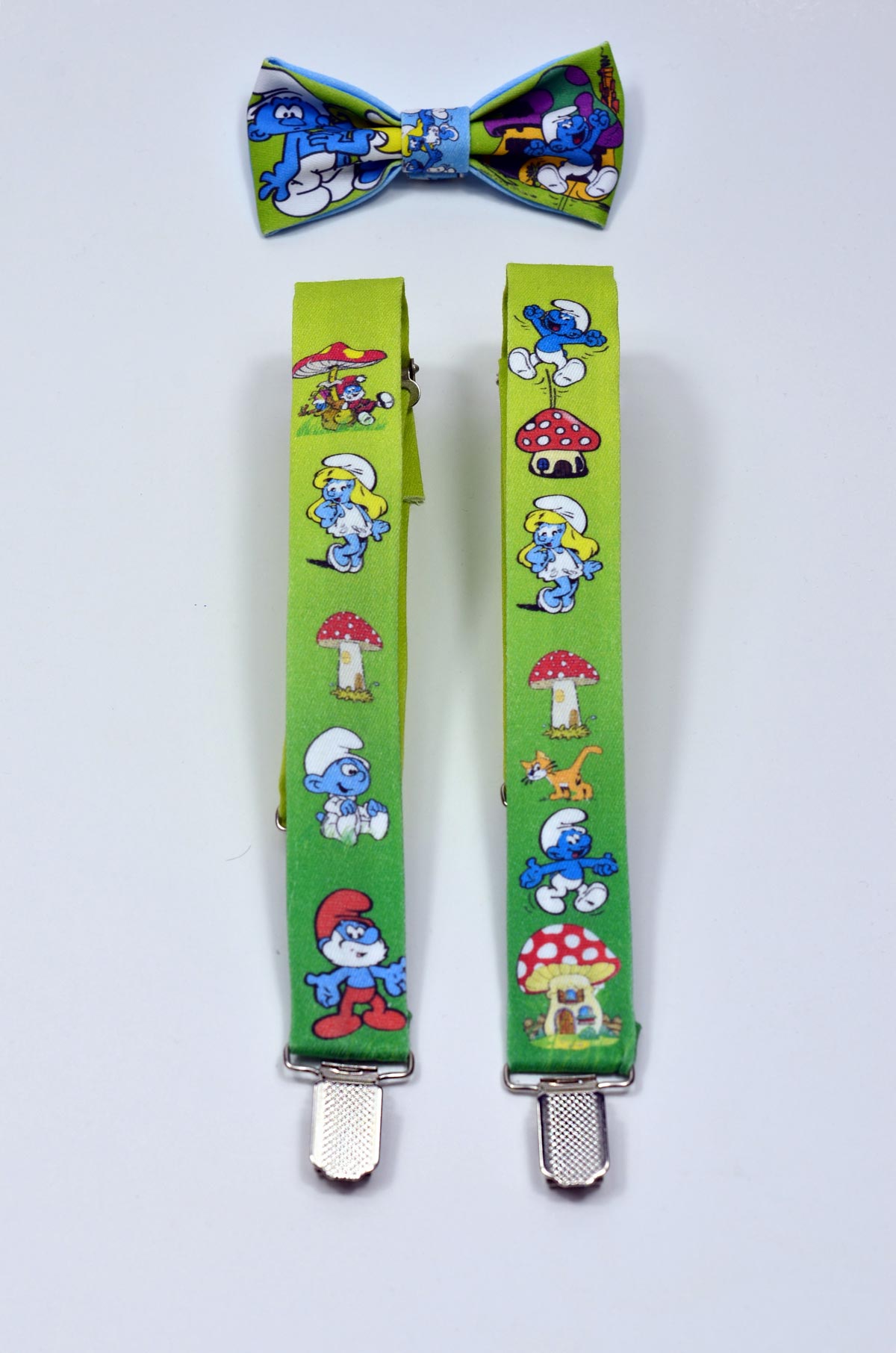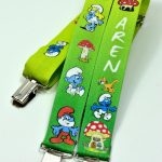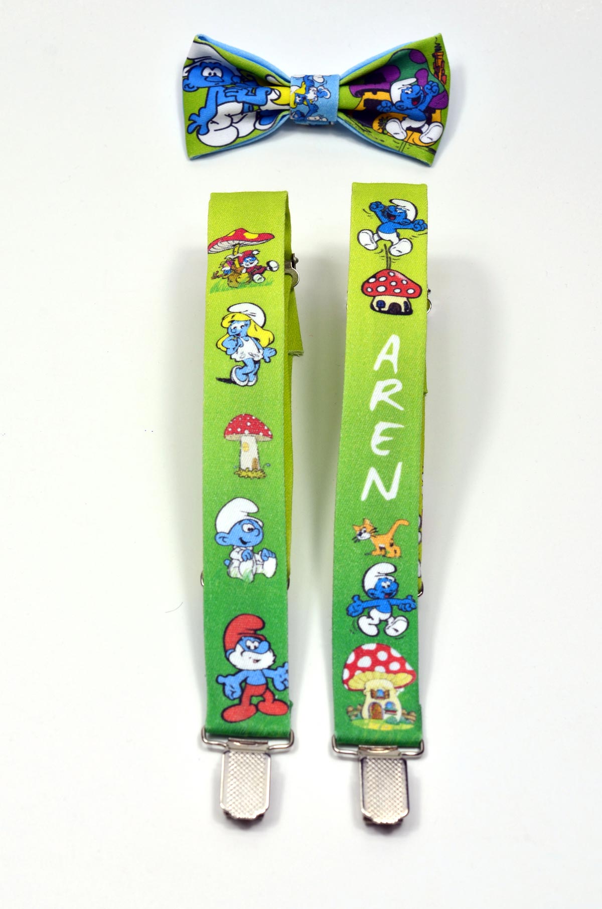 Şirinler Temalı Papyon ve Pantolon Askısı baskılı isime özel üretim erkek çocuk papyon ve pantolon askısı