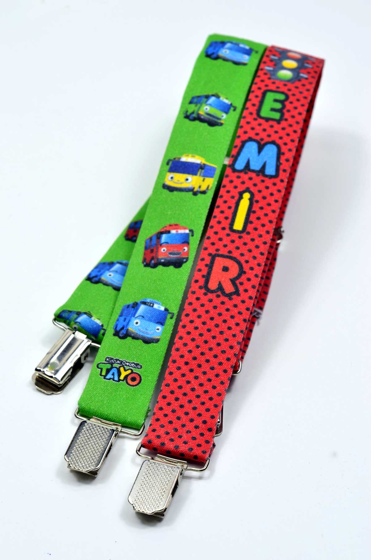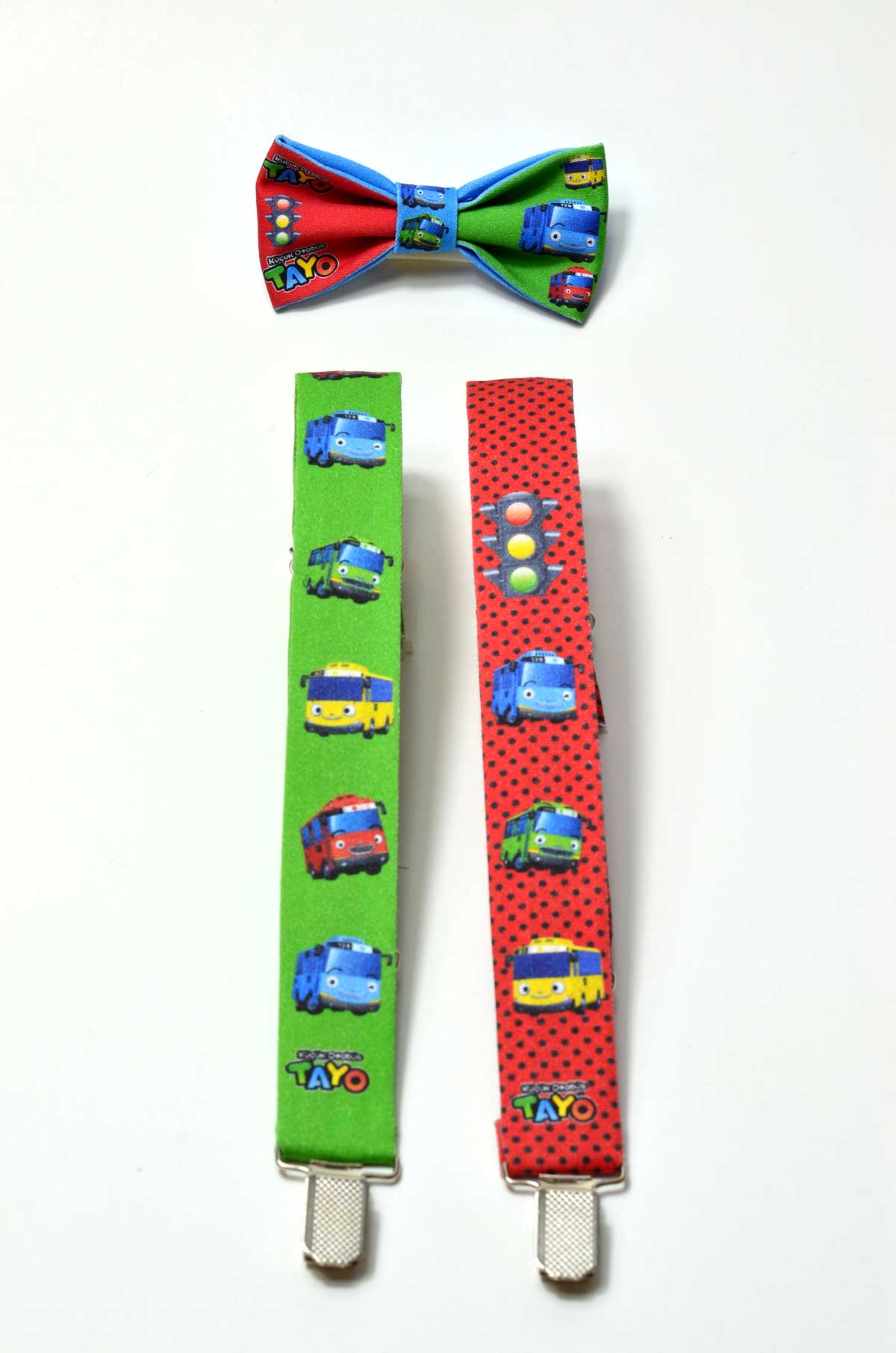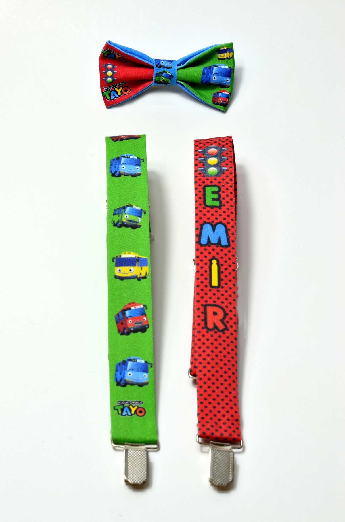 Tayo Temalı Papyon ve Pantolon Askısı baskılı isime özel üretim erkek çocuk papyon ve pantolon askısı